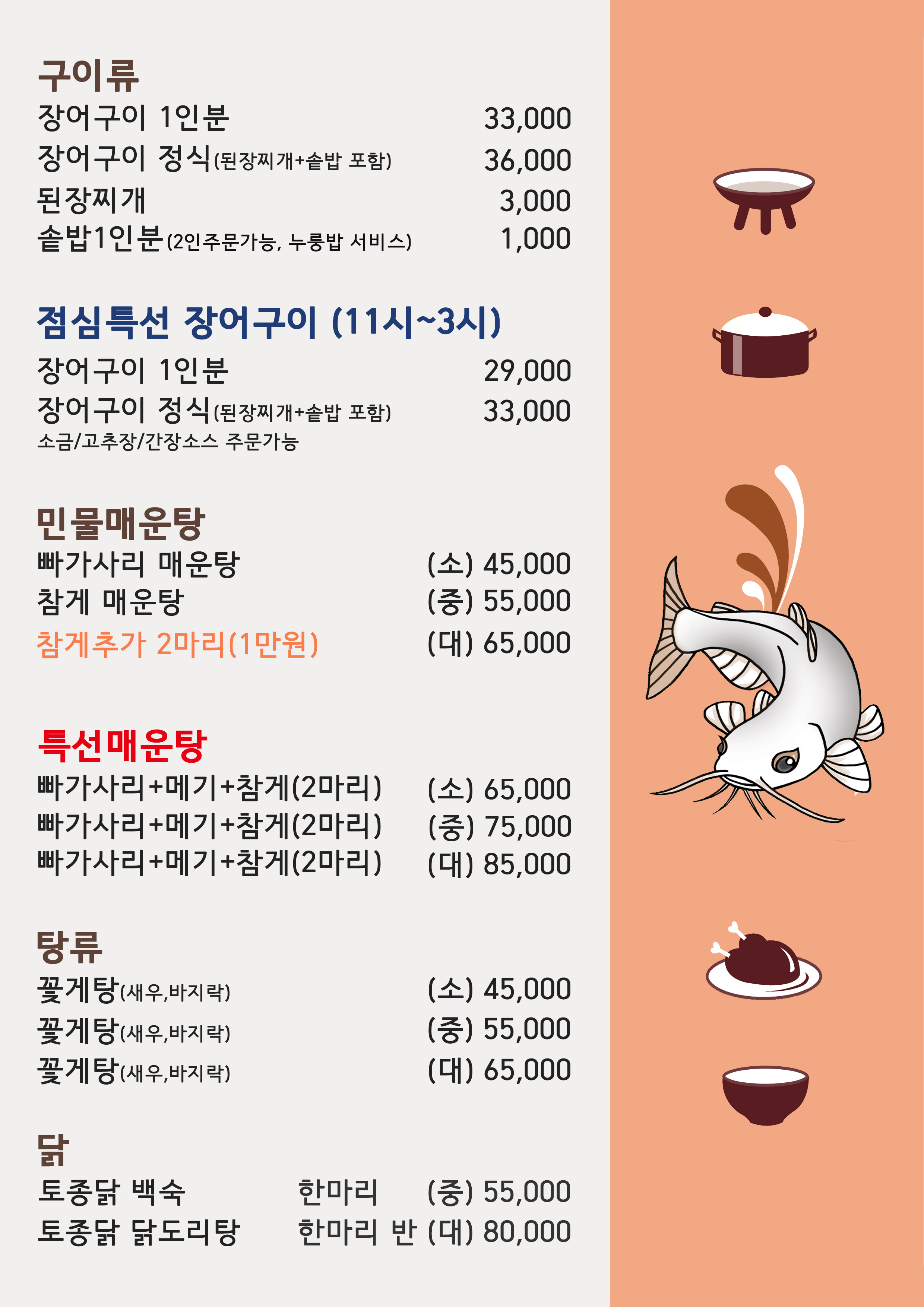 그리고 민물매운탕은 점심특선으로