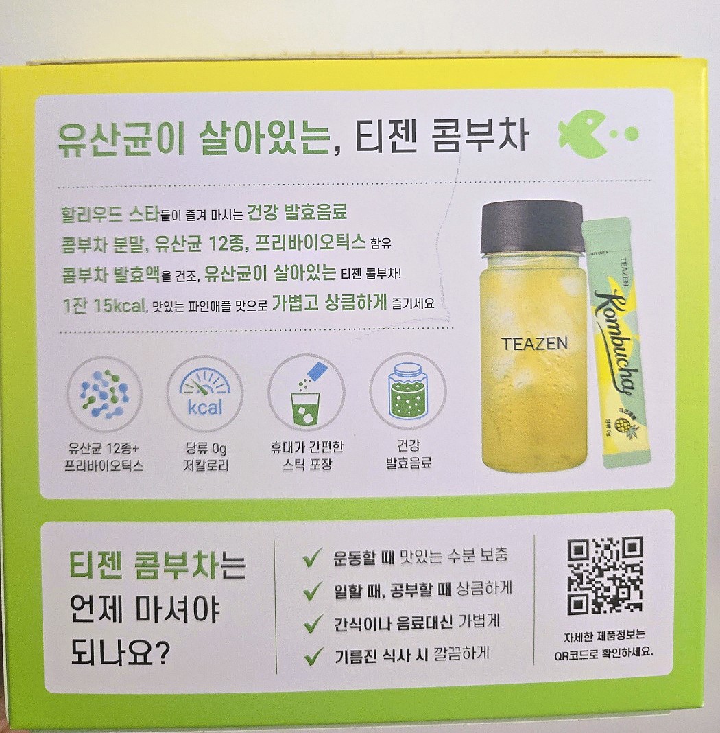 티젠 콤부차는 파우더 형태로 만들어져 물에 타서 마시는 제품입니다. 다양한 맛(레몬, 복숭아, 베리 등)이 있어 아이들이 흥미를 가지기 쉽고, 탄산처럼 톡 쏘는 맛이 있어 일반 탄산음료 대용으로 찾는 분들도 많습니다.